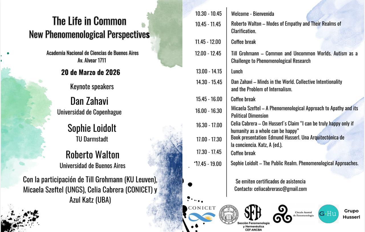 Estimada Comunidad Académica: Tenemos el agrado de invitarlos a participar de las actividades que se desarrollarán en el marco de la visita a Buenos Aires de Dan Zahavi (Universidad de Copenhague) y Sophie Loidolt (TU Darmstadt), durante el mes de marzo de 2026. A continuación, detallamos el cronograma de actividades: Actividad 1 Jueves 5 de marzo de 2026 | 14 h Academia Nacional de Ciencias de Buenos Aires (Av. Alvear 1711, 3er piso) Workshop sobre el libro de Dan Zahavi _Being We: Phenomenological Contributions to Social Ontology_ Actividad 2 Lunes 9 de marzo de 2026 | (TBD) Facultad de Ciencias Sociales - UBA Actividad 3 Jueves 12 de marzo de 2026 | 14 h Universidad Católica Argentina (Alicia Moreau de Justo 1500) Conferencia de Dan Zahavi: "Empathy, Morality and Care" Actividad 4 Viernes 20 de marzo de 2026 | 10 h Academia Nacional de Ciencias de Buenos Aires (Av. Alvear 1711, 3er piso) Conferencias de Dan Zahavi y Sophie Loidolt en el marco de las Jornadas _The Life in Common - New Phenomenological Perspectives_ Conferencias: * Dan Zahavi: "Minds in the World: Collective Intentionality and the Problem of Internalism" * Sophie Loidolt: "Phenomenology of the Public Realm" Actividad 5 Miércoles 25 de marzo de 2026 | 16 h Facultad de Filosofía y Letras, Universidad de Buenos Aires (UBA) (Puán 480) Conferencias: * Dan Zahavi: "Psychedelic Ego-Dissolution: A Phenomenological Perspective" * Sophie Loidolt: "Arendt as a Phenomenologist" Contacto: celiacabrerasc@gmail.com Un saludo Dr. Julio Castello Dubrá (Director) Prof. Facundo Jaime (Secretario académico) Prof. Lucía Ceballos (Comunicación) -- Departamento de Filosofía Facultad de Filosofía y Letras - Universidad de Buenos Aires (54-11) 5287-2826 Puan 480 (CP: C1406CQJ) - C.A.B.A. - Web: filosofia.filo.uba.ar - Facebook: facebook.com/defilo.uba [1] - YouTube: youtube.com/defilouba [2] Links: ------ [1] http://www.facebook.com/defilo.uba [2] http://www.youtube.com/defilouba