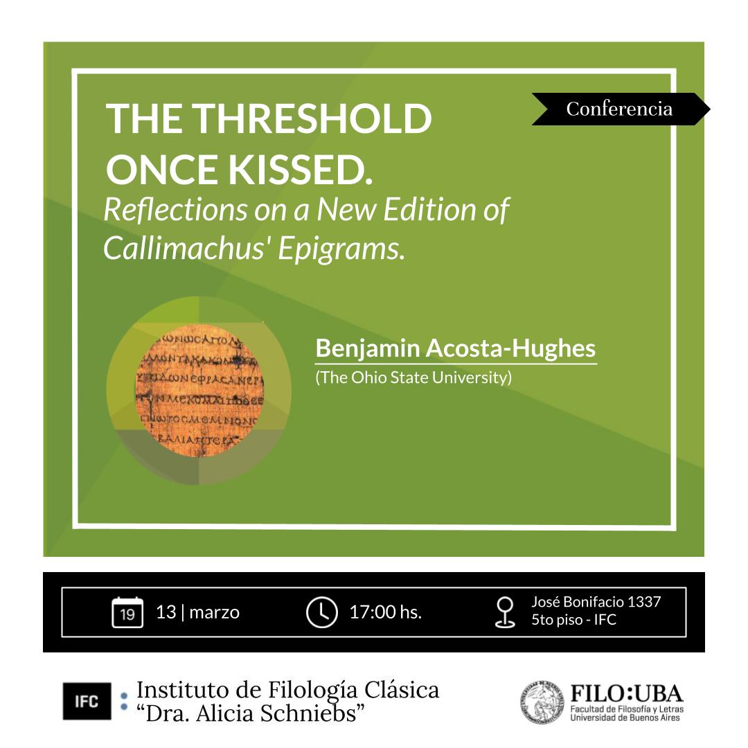 Estimadxs: Compartimos información que puede ser de interés. Saludos cordiales, -------- Mensaje original -------- ASUNTO: Difusión | Visita de Benjamin Acosta-Hughes FECHA: 10.03.2026 16:05 REMITENTE: Instituto de Filología Clásica FFyL UBA <filologiaclasicauba@gmail.com> DESTINATARIO: secretariaadec@gmail.com, Departamento de Letras Clasicas <letrasclasicas@filo.uba.ar> Estimadas/os, Invitamos a la comunidad de clásicas a participar este viernes 13 de marzo a las 17 h de la conferencia [1] que brindará Benjamin Acosta-Hughes (The Ohio State University) intitulada "The Threshold Once Kissed. Reflections on a New Edition of Callimachus' Epigrams" en la sede del Instituto de Filología Clásica "Dra. Alicia Schniebs" de la Facultad de Filosofía y Letras de la Universidad de Buenos Aires (Bonifacio 1337, 5°piso, CABA). Asimismo, y en el marco de su estancia en el país, el profesor dictará una clase para estudiantes de grado sobre poesía helenística y su diálogo con la literatura latina el próximo jueves 19 de marzo a las 18 h (Aula B-201, Anexo Bonifacio de la Facultad de Filosofía y Letras, UBA). Benjamin Acosta-Hughes es profesor de griego y latín en la Ohio State University, y profesor asociado externo de la Università di Roma Tre y de la Università di Piemonte Orientale Vercelli. Realizó su doctorado en la Universidad de California (1995). Sus áreas de interés son la poesía helenística y la literatura griega. Ha editado los volúmenes _Labored in Papyrus Leaves: Perspectives on an Epigram Collection Attributed to Posidippus_ (2004), _Brill's Companion to Callimachus_ (2011), _Homère Revisité: Parodie et humour dans les réécritures homériques_ (2011), _Euphorion de Chalcis. Les Fragments_ (2012), _The Door Ajar. False Closure in Greek and Roman Literature and Art_ (2013), _Hellenistic Literature and Culture. Studies in Honor of Susan A. Stephens_ (2024). Es autor de _Polyeideia--The Iambi of Callimachus and the Archaic Iambic Tradition_ (2002), _Arion's Lyre. Archaic Lyric into Hellenistic Poetry_ (2010), _Callimachus in Context. From Plato to the Augustan Poets_ (2012), _The Laurel and the Olive. Collected Essays on Archaic and Hellenistic Poetry_ (2024), _Callimachus - The Epigrams_ (2025), así como de numerosos artículos sobre su especialidad. *** Enzo Diolaiti Secretario Académico El IFC en las redes https://twitter.com/IFC_UBA https://www.facebook.com/IFC.FFyL.UBA https://www.instagram.com/institutodefilologiaclasica/ https://www.youtube.com/c/institutodefilologiaclasicaffyluba -- Departamento de Lenguas y Literaturas Clásicas Web: http://letrasclasicas.filo.uba.ar/ Facebook: https://www.facebook.com/clasicasuba/ Instagram: https://www.instagram.com/clasicasuba/ Twitter: https://twitter.com/clasicasuba Links: ------ [1] https://ifc.institutos.filo.uba.ar/evento/conferencia-acosta-hughes