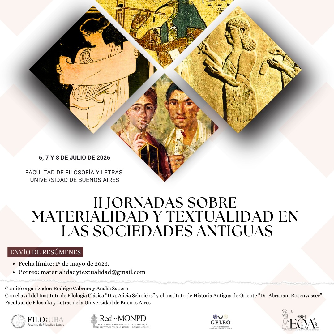 Estimadxs: Compartimos información que puede ser de interés. Saludos cordiales -------- Mensaje original -------- ASUNTO: [IFC-UBA] II Jornadas sobre materialidad y textualidad en las sociedades antiguas FECHA: 17.03.2026 15:33 REMITENTE: Instituto de Filología Clásica "Dra. Alicia Schniebs" <filologiaclasica@filo.uba.ar> DESTINATARIO: Lista Difusión IFC <filologiaclasica@difusion.filo.uba.ar> Estimadas, estimados, Se reenvía información que puede ser de su interés. Saludos cordiales, -------- Mensaje original -------- En continuidad con la primera edición, el encuentro se propone reflexionar sobre la relación entre materialidad y textualidad en las sociedades antiguas y convoca a trabajos que aborden, entre otros, los siguientes ejes: la materialidad de la documentación escrita (desde perspectivas epigráficas, paleográficas y/o iconográficas); el campo de significación de los soportes de escritura y su capacidad indiciaria; la interrelación entre soportes, textos e iconografía; los soportes de escritura mencionados en textos literarios; las prácticas de escritura y circulación de textos; la función social de los registros escritos en distintos ámbitos (educativo, administrativo, legal, litúrgico, cultual); la construcción de espacialidades a partir de narrativas y reutilización de lugares; la interacción sujeto/objeto en los registros escritos; y los agentes e interpretantes involucrados en los contextos de producción, circulación y apropiación de distintas materialidades. · Las jornadas se realizarán los días 6, 7 y 8 de julio de 2026 en la Facultad de Filosofía y Letras de la Universidad de Buenos Aires. · La fecha límite para el envío de resúmenes es el 1º de mayo de 2026. · Los resúmenes y consultas pueden enviarse a: materialidadytextualidad@gmail.com. · Las jornadas se desarrollarán de forma presencial en las instalaciones de la Facultad de Filosofía y Letras de la Universidad de Buenos Aires. Se dispondrá del primer día del evento para la participación virtual de investigadores/as, docentes y estudiantes de otros países. En el archivo adjunto encontrarán la circular con la información detallada, así como el flyer. Agradecemos de antemano su colaboración. Saludos cordiales, Analía Sapere y Rodrigo Cabrera Comité organizador -- Instituto de Filología Clásica "Dra. Alicia Schniebs" Facultad de Filosofía y Letras Universidad de Buenos Aires José Bonifacio 1337 - 5to. piso Ciudad de Buenos Aires Tel. 5287-2878 filologiaclasica@filo.uba.ar http://ifc.institutos.filo.uba.ar http://www.facebook.com/IFC.FFyL.UBA http://twitter.com/IFC_UBA _______________________________________________ Lista de correo Filologiaclasica -- filologiaclasica@difusion.filo.uba.ar Para desuscribirse envíe un email a filologiaclasica-leave@difusion.filo.uba.ar -- Departamento de Lenguas y Literaturas Clásicas Web: http://letrasclasicas.filo.uba.ar/ Facebook: https://www.facebook.com/clasicasuba/ Instagram: https://www.instagram.com/clasicasuba/ Twitter: https://twitter.com/clasicasuba
