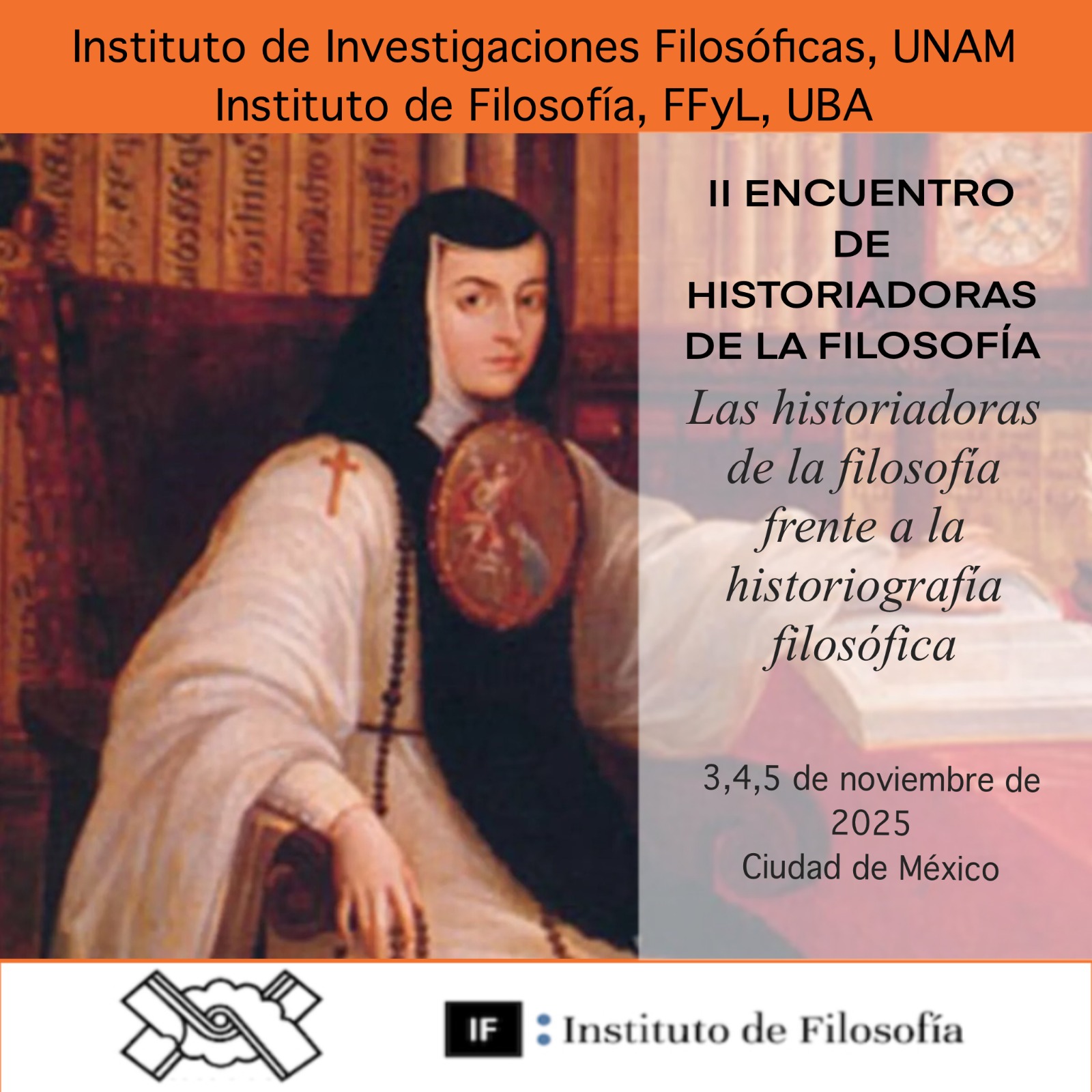Estimadxs Investigadorxs: El Instituto de Filosofía y el Instituto de Investigaciones Filosóficas de la UNAM invitan al II Encuentro de Historiadoras de la Filosofía, que tendrá lugar los días 3,4 y 5 de noviembre de 2025 en la Ciudad de México. La primera edición se llevó a cabo en nuestra facultad (sede 25 de Mayo) en abril de 2023. Se adjunta el llamado a contribuciones. Saludos cordiales, Marcelo