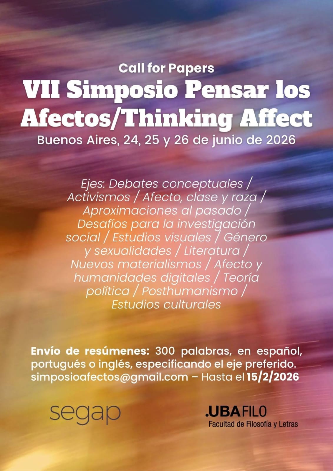 Estimadxs Investigadorxs: Compartimos la invitación al VII Simposio Pensar los Afectos. Saludos cordiales, Marcelo VII Simposio Pensar los Afectos/Thinking Affect. Buenos Aires, 24, 25 y 26 de junio de 2026. SEGAP (Seminario sobre Género, Afectos y Política, Instituto de Filosofía Alejandro Korn, Universidad de Buenos Aires) convoca a la presentación de propuestas para participar del VII Simposio Pensar los Afectos/Thinking Affect. El encuentro, de carácter abierto y transdisciplinario, tiene como objetivo desplegar el debate plural construido desde el primer simposio realizado en 2013. A partir del cambio de siglo, el llamado giro afectivo ha transformado las formas de pensar el campo de las Humanidades y las Ciencias Sociales sin por ello pretender constituirse en una teoría total. Desde distintas disciplinas --filosofía, teoría crítica, estudios culturales, feminismos, antropología, artes, historia o literatura--, los afectos se han convertido en un campo de exploración privilegiado para comprender cómo se configuran los vínculos, las pertenencias y las formas de vida contemporáneas. Atendiendo en muchos casos a una relectura de discusiones filosóficas previas y en otros a intervenciones que se pretenden inaugurales, los debates del campo han comenzado a permear disputas y vocabularios más recientes. Así, serán especialmente valoradas las propuestas que hagan foco en el impacto del giro afectivo en el desarrollo de los debates más incipientes de las Humanidades y las Ciencias Sociales. Se recibirán ponencias que aborden los siguientes ejes temáticos: -Debates conceptuales -Activismos -Afecto, clase y raza -Aproximaciones al pasado -Desafíos para la investigación social -Estudios visuales -Género y sexualidades -Literatura -Humanidades digitales -Nuevos materialismos -Teoría política -Posthumanismo -Estudios culturales Envío de resúmenes: hasta 300 palabras del 15/11/25 al 15/2/26 a simposioafectos@gmail.com. Para facilitar la organización temática de las mesas se solicita aclarar en el envío el eje de preferencia. Se aceptarán propuestas de carácter artístico solo en tanto el espacio y la logística lo permitan. Idiomas: español, portugués e inglés. https://segapblog.wordpress.com Cecilia Macón Universidad de Buenos Aires-CONICET-SEGAP https://segapblog.wordpress.com