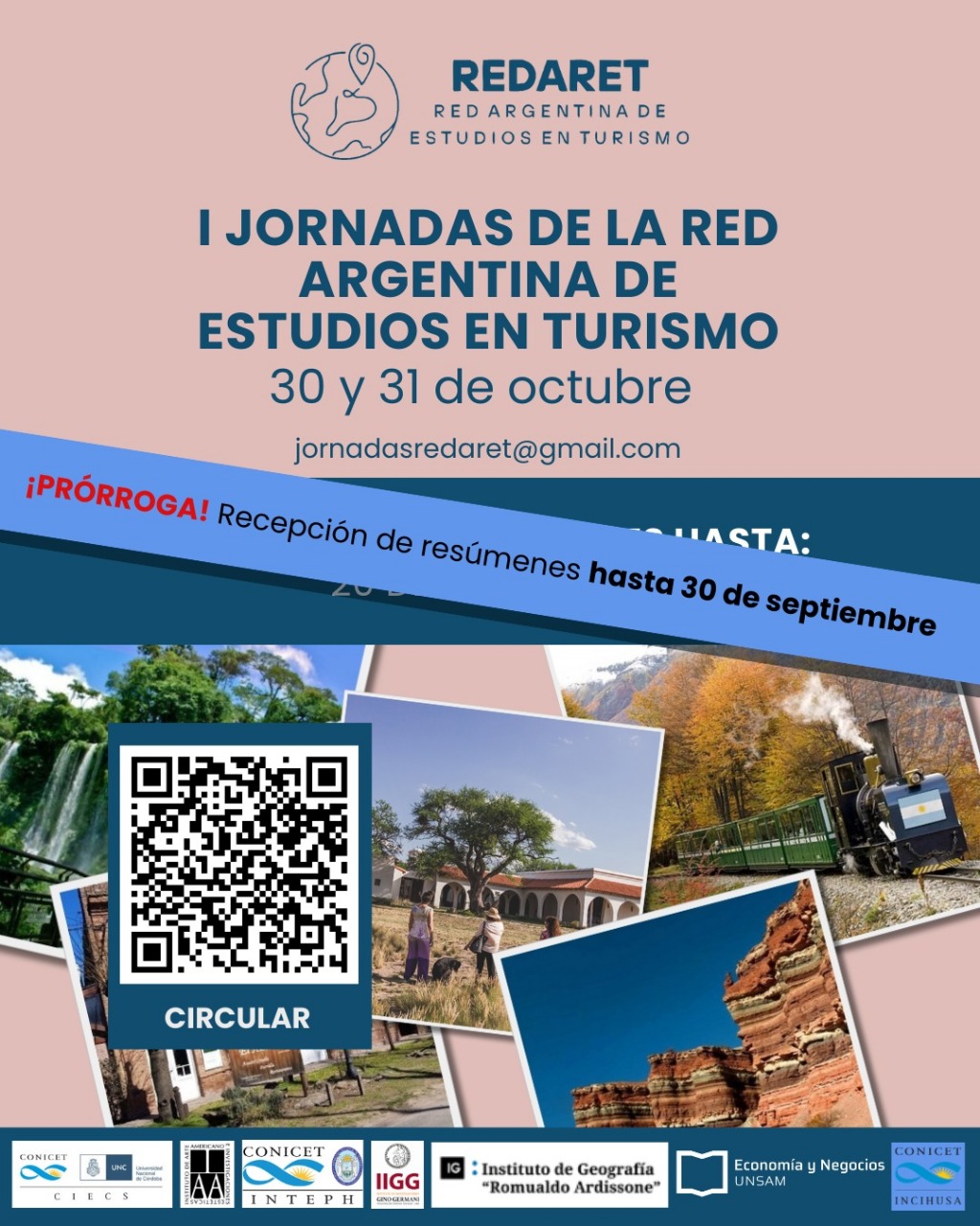 Estimadxs, Compartimos la realización de las I Jornadas de la Red Argentina de Estudios en Turismo (RedArET), evento que cuenta con el aval del nuestro instituto y en cuya organización participa nuestra investigadora Cecilia Pérez Winter. Se realizará de forma virtual los días 30 y 31 de octubre. Hasta el 30 de septiembre se reciben propuestas para participar en las mesas temáticas. Para acceder a la segunda circular: aquí [1] La Red Argentina de Estudios en Turismo (RedArET) surge como un espacio académico fundamental para el análisis del turismo como fenómeno contemporáneo, promoviendo discusiones interdisciplinarias desde miradas críticas, plurales y éticas. La propuesta de realizar estas primeras jornadas federales de manera virtual se fundamenta se fundamenta en la propia naturaleza y evolución de la Red. Conformada desde 2023 por diversos investigadorxs, docentes, técnicxs, gestores y estudiantes con interés en el estudio del turismo, la RedArET ha logrado una representatividad federal que abarca las provincias argentinas de Mendoza, Tucumán, Tierra del Fuego, Santa Fe, San Luis, La Rioja, Neuquén, La Pampa, Jujuy, Corrientes, Córdoba, Buenos Aires y la Ciudad Autónoma de Buenos Aires. Agradecemos su difusión y esperamos contar con su participación. -- Instituto de Geografía "Romualdo Ardissone" Facultad de Filosofía y Letras - Universidad de Buenos Aires Web: http://geografia.institutos.filo.uba.ar/ IG: institutogeografiauba [2] Facebook: @InstitutodeGeografiaUBA [3] [4] Links: ------ [1] https://drive.google.com/file/d/1zg_btsv_BAkNXh6Xt9TSrCBb53HMc6pJ/view [2] https://www.instagram.com/institutogeografiauba/ [3] https://www.facebook.com/InstitutodeGeografiaUBA [4] http://geografia.institutos.filo.uba.ar/